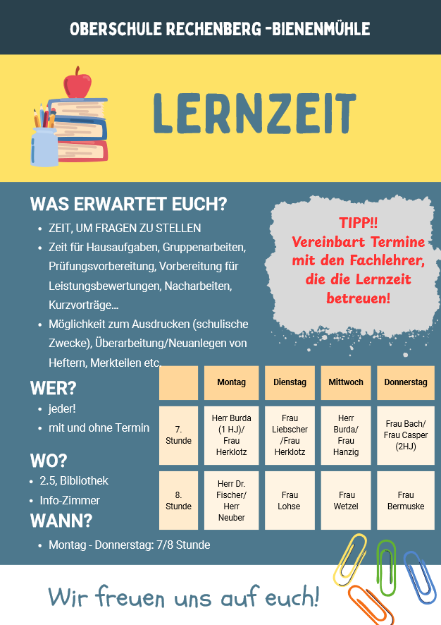 Die Nachschreibstunde für Leistungskontrollen und Klassenarbeiten findet donnerstags in der 7. - 9. Stunde im Zi. 3.2 statt.